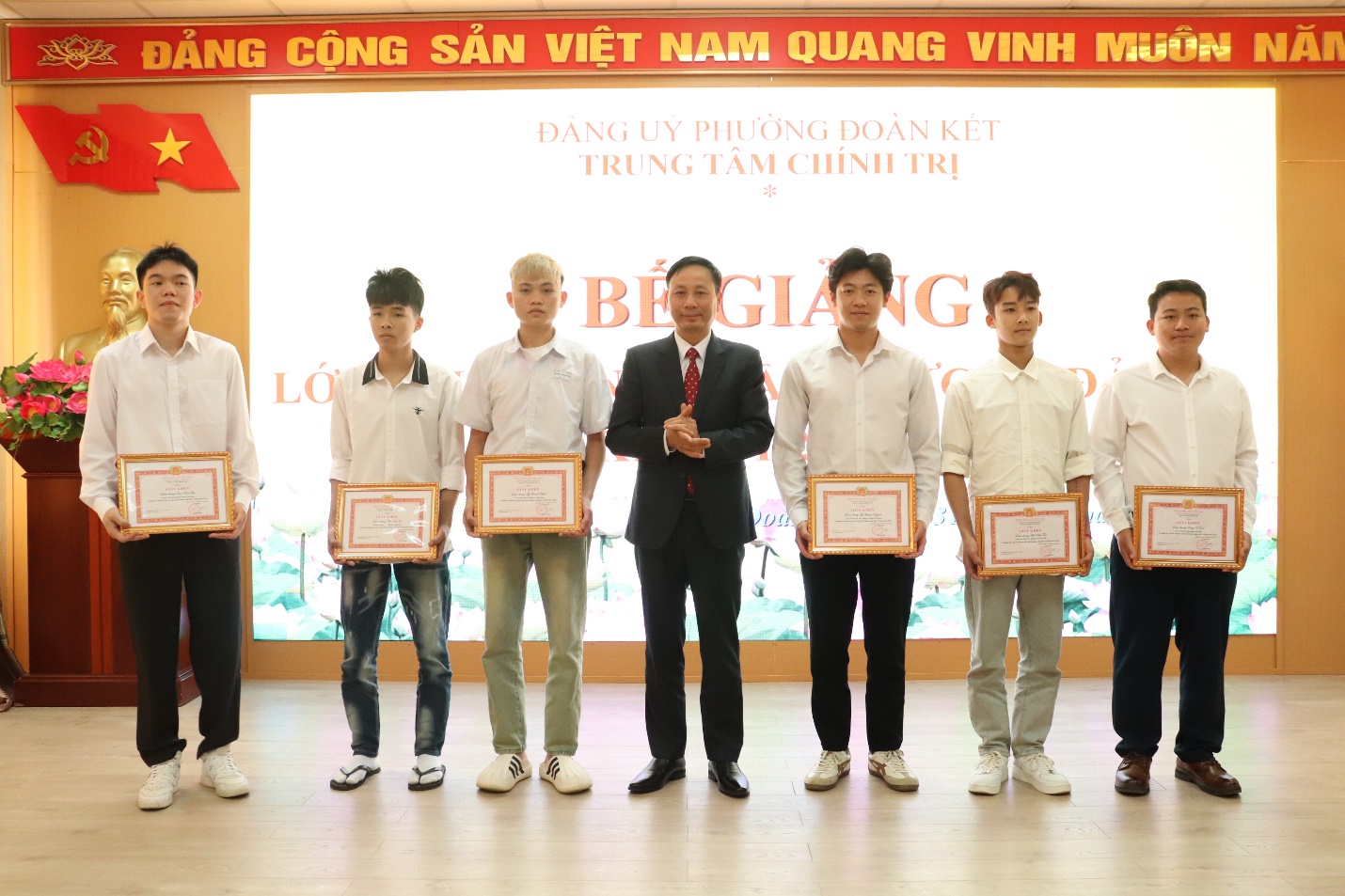 Chiều 31/ 01, Trung tâm Chính trị phường tổ chức bế giảng lớp Bồi dưỡng nhận thức về Đảng khóa I năm 2026 dành cho thanh niên nhập ngũ. Dự Bế giảng có đồng chí Trần Đình Tiến – Phó Bí thư thường trực, phụ trách Đảng bộ phường, lãnh đạo Ban CHQS phường, Trung tâm Chính trị Đoàn Kết.