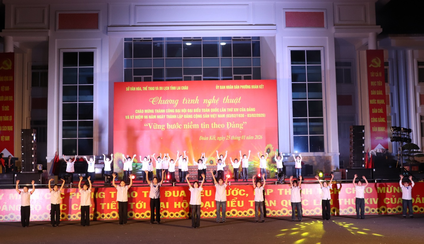 Tối nay (25/01), tại Quảng trường phường Đoàn Kết, Sở Văn hoá, Thể thao và Du lịch tỉnh Lai Châu phối hợp với UBND phường Đoàn Kết tổ chức Chương trình nghệ thuật chào mừng thành công Đại hội Đại biểu toàn quốc lần thứ XIV của Đảng và kỷ niệm 96 năm Ngày thành lập Đảng Cộng sản Việt Nam (03/02/1930 – 03/02/2026).