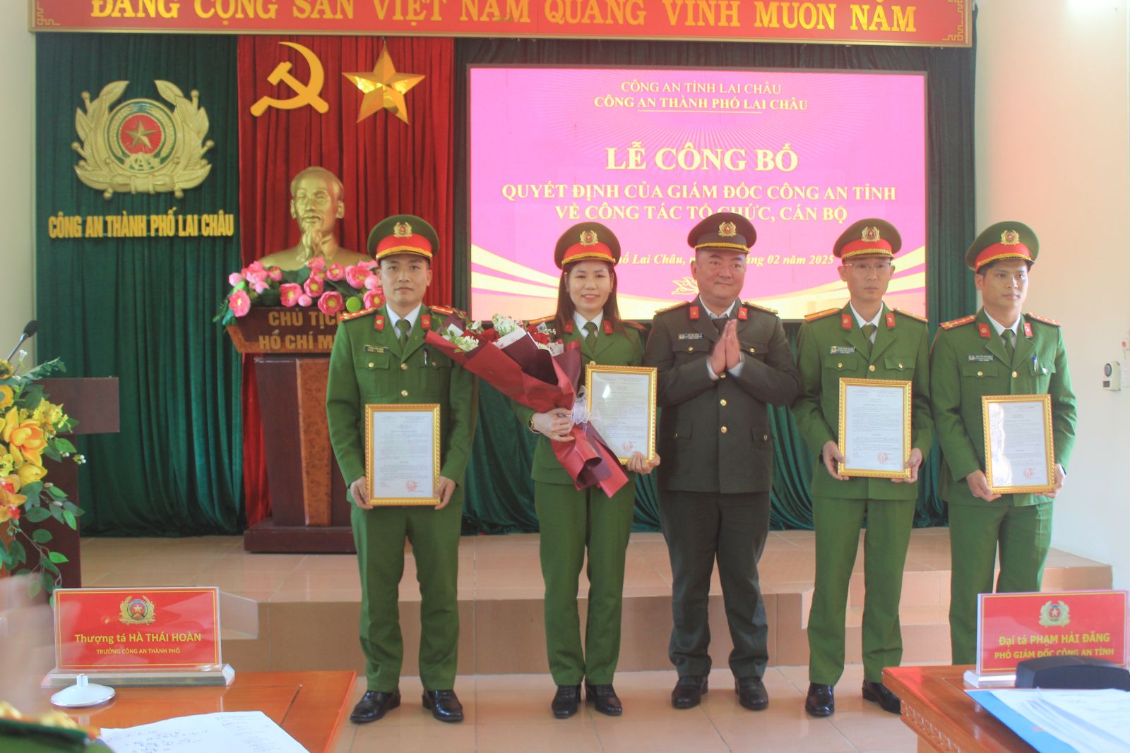 Theo đó, Thượng tá Hà Thái Hoàn, Trưởng Công an Thành phố Lai Châu được điều động, nhận công tác, giữ chức vụ Chánh Thanh tra công an tỉnh. Đồng thời, công bố, trao quyết định về việc bố trí công tác đối với các đồng chí giữ chức vụ là Trưởng, Phó Trưởng Công an các xã, phường của thành phố Lai Châu.