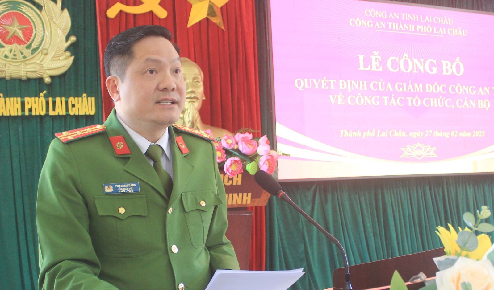 Chiều 27/2, Công an thành phố Lai Châu tổ chức Lễ công bố Quyết định của Giám đốc Công an tỉnh Lai Châu về công tác tổ chức, cán bộ. Dự chỉ đạo buổi lễ có Đại tá Phạm Hải Đăng, Phó Giám đốc Công an tỉnh; đồng chí Đặng Quang Chung – Phó Bí thư Thường trực Thành ủy, lãnh đạo UBND thành phố, đại diện lãnh đạo các cơ quan khối nội chính cùng tập thể lãnh đạo, chỉ huy và cán bộ, chiến sỹ Công an thành phố.