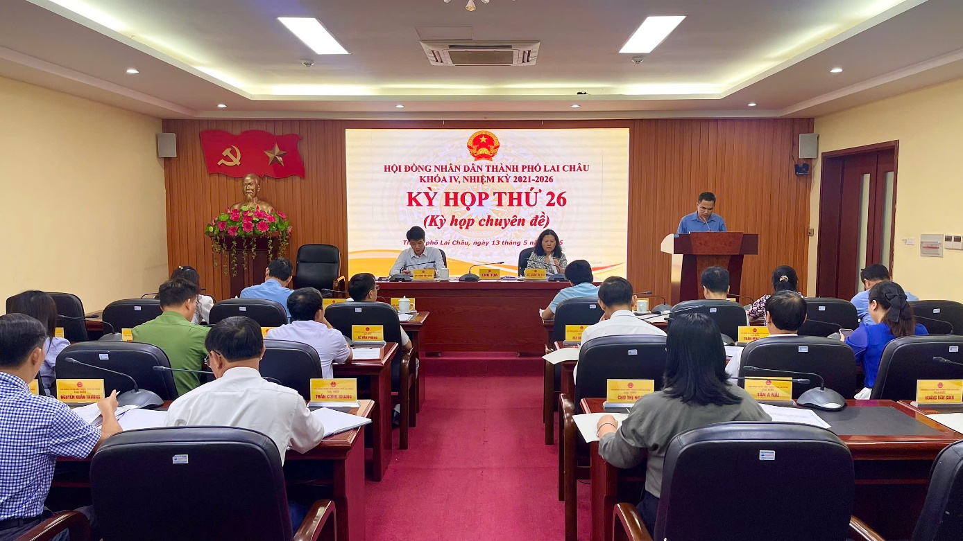 Kết thúc kì họp thứ 26, HĐND thành phố Lai Châu khóa IV, nhiệm kì 2021 – 2026 đã thông qua: Nghị quyết phê chuẩn quyết toán thu ngân sách nhà nước trên địa bàn; quyết toán thu, chi ngân sách địa phương năm 2024. Nghị quyết về bổ sung kinh phí sự nghiệp thực hiện Chương trình MTQG giảm nghèo bền vững giai đoạn 2021-2025, Chương trình xóa nhà tạm, nhà dột nát cho hộ nghèo, hộ cận nghèo; bổ sung kinh phí để thực hiện các chế độ, chính sách và các nhiệm vụ phát sinh năm 2025 cho các cơ quan, đơn vị, xã phường thành phố Lai Châu. Nghị quyết về điều chỉnh kế hoạch vốn và bổ sung danh mục dự án đầu tư công trung hạn nguồn vốn ngân sách Trung ương thực hiện các Chương trình MTQG giai đoạn 2021-2025. Nghị quyết về kết quả giám sát việc thực hiện Nghị quyết số 128/NQ-HĐND ngày 12/12/2020 của HĐND thành phố Lai Châu khoá III về kế hoạch phát triển kinh tế - xã hội, đảm bảo quốc phòng - an ninh 5 năm giai đoạn 2021-2025.