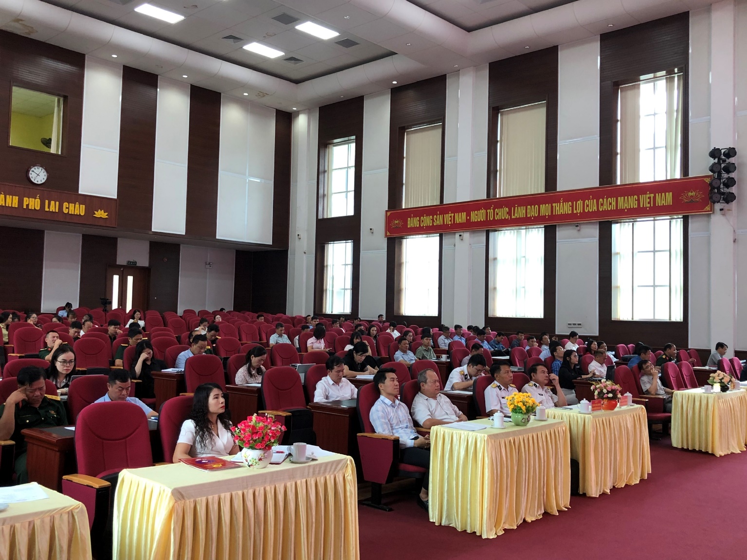Dự Hội nghị có các đồng chí: Đại tá Vũ Xuân Tình, Phó Chủ nhiệm Chính trị Bộ tham mưu Quân chủng Hải quân; Lê Chí Công, Phó Trưởng Ban Tuyên giáo Tỉnh ủy; Đặng Quang Chung – Phó Bí thư Thường trực Thành ủy Lai Châu; các đồng chí báo cáo viên TW của tỉnh, Báo cáo viên cấp tỉnh của các sở, ban, ngành trên địa bàn thành phố Lai Châu; đại diện lãnh đạo các cơ quan tư tưởng – văn hóa tỉnh, Sở Thông tin và Truyền thông; các đồng chí báo cáo viên thành phố, thường trực Đảng ủy xã, phường thành phố Lai Châu.