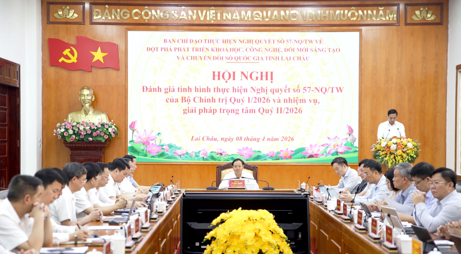 Sáng 8/4, Ban Chỉ đạo thực hiện Nghị quyết số 57-NQ/TW tỉnh Lai Châu tổ chức hội nghị đánh giá tình hình thực hiện quý I/2026, triển khai nhiệm vụ trọng tâm quý II/2026. Đồng chí Lê Minh Ngân - Ủy viên Ban Chấp hành Trung ương Đảng, Bí thư Tỉnh ủy, Chủ tịch HĐND tỉnh, Trưởng Ban Chỉ đạo chủ trì hội nghị.