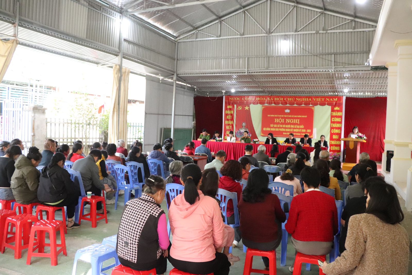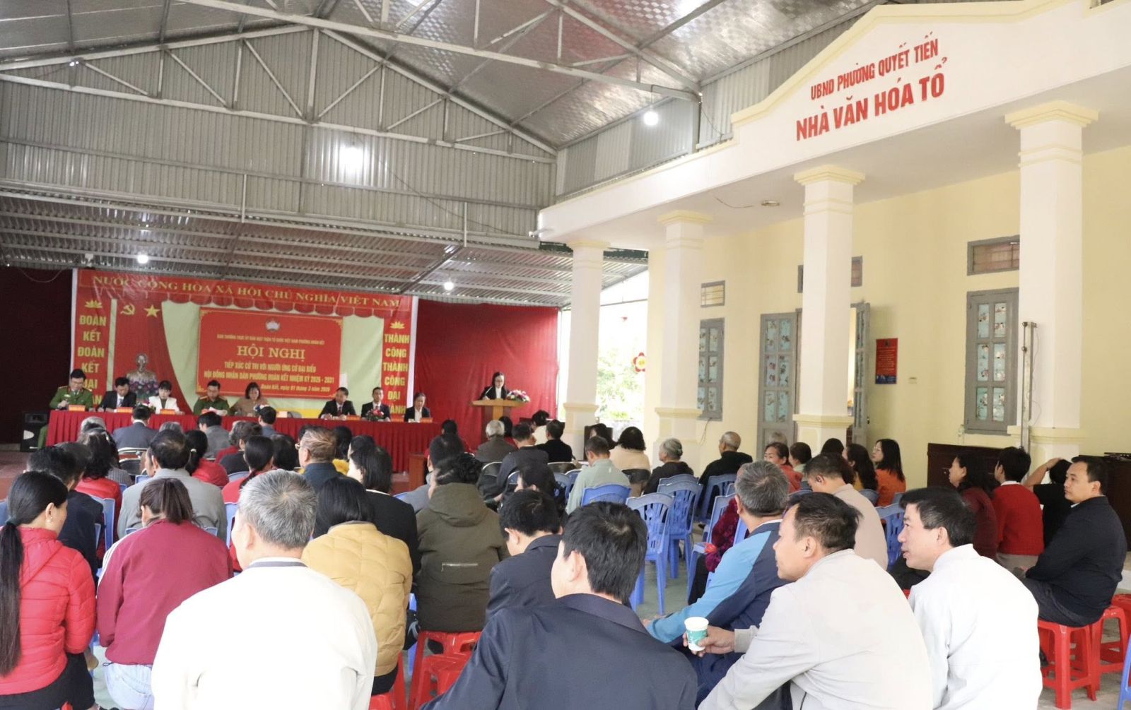 Cử tri các tổ dân phố Quyết Tiến 1,2,3 lắng nghe chương trình hành động của người ứng cử.