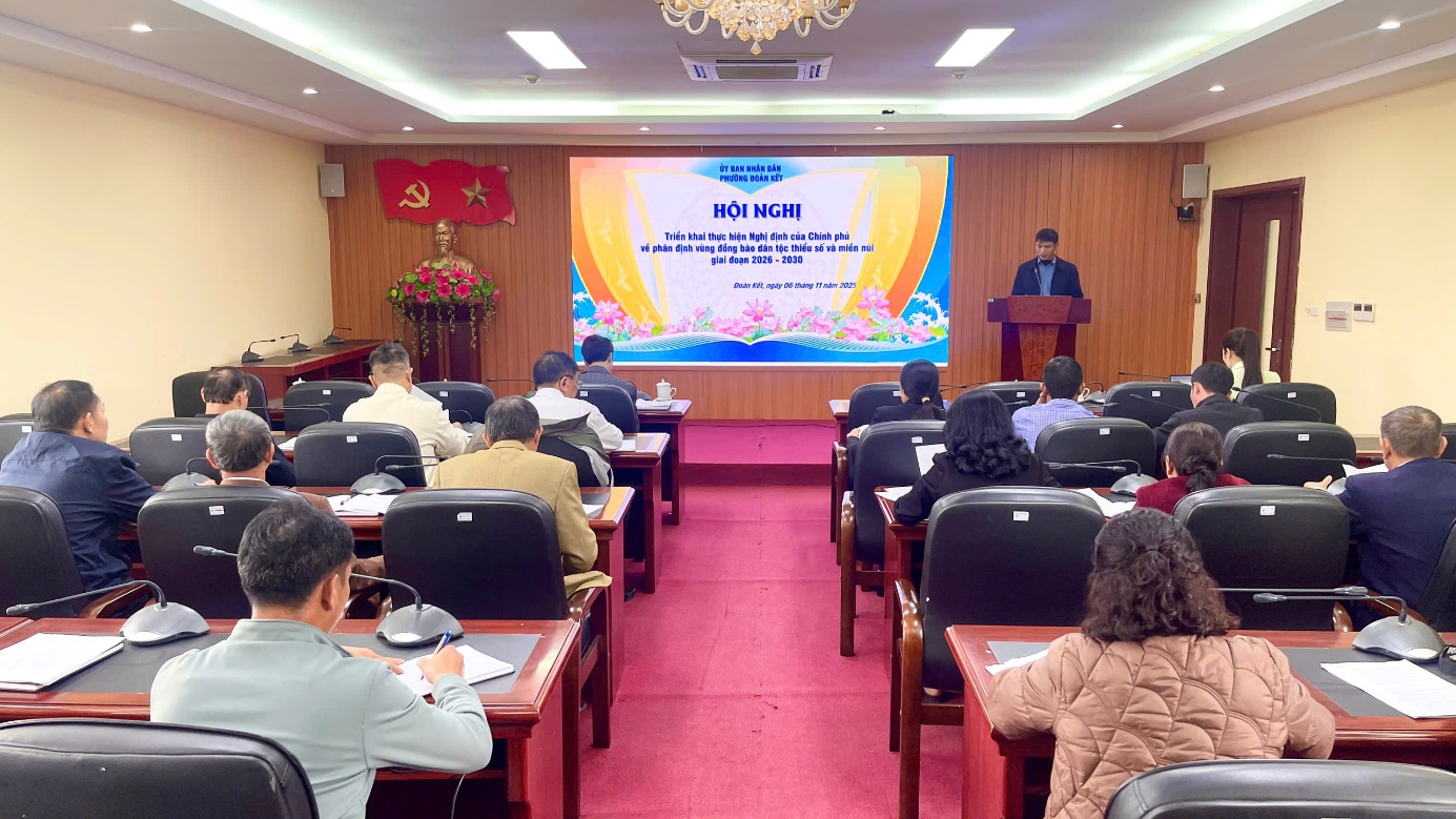 Chiều ngày 06/11, UBND phường Đoàn Kết tổ chức Hội nghị triển khai thực hiện Nghị định của Chính phủ về phân định vùng đồng bào dân tộc thiểu số và miền núi giai đoạn 2026 – 2030. Dự Hội nghị có các đồng chí lãnh đạo phòng chuyên môn phường, tổ trưởng 48 tổ dân phố trên địa bàn phường. Đồng chí Đặng Việt Hưng – Ủy viên BTV Đảng ủy, Phó Chủ tịch UBND phường chủ trì hội nghị.