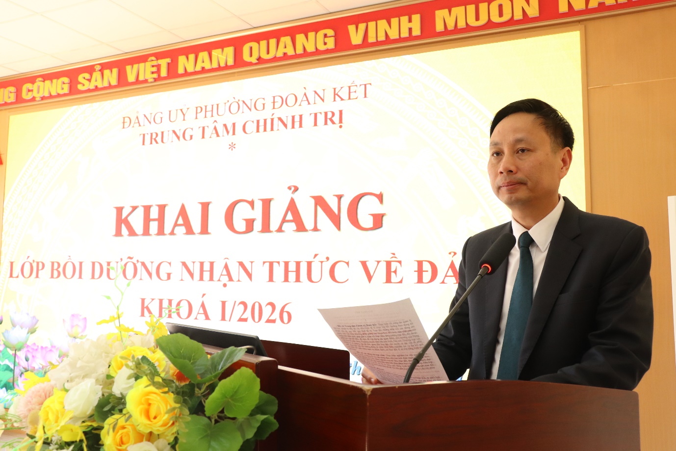 Phát biểu tại Lễ khai giảng, đồng chí Trần Đình Tiến – Phó Bí thư Thường trực, phụ trách Đảng bộ phường; đồng chí Lò Văn Miên, Giám đốc Trung tâm Chính trị Đoàn Kết đề nghị các học viên cần xác định lý tưởng, mục tiêu nhiệm vụ và kế hoạch của mình; nghiêm túc trong học tập, rèn luyện; bố trí sắp xếp thời gian tham gia lớp học đảm bảo theo quy định. Đồng thời yêu cầu các đồng chí giảng viên nêu cao tinh thần trách nhiệm trong giảng dạy, truyền đạt kiến thức, tạo điều kiện để học viên học tập đạt kết quả cao nhất.
