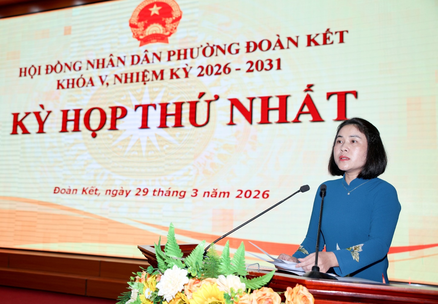 Phát biểu chỉ đạo kỳ họp, đồng chí Đào Thị Lan Anh - Bí thư Đảng uỷ phường Đoàn Kết chúc mừng các đại biểu đã trúng cử vào HĐND phường khóa V. Đồng thời, đề nghị, các đại biểu HĐND phát huy dân chủ, khách quan, công tâm lựa chọn các đồng chí thực sự xứng đáng để bầu các chức danh lãnh đạo HĐND, UBND phường nhiệm kỳ 2026-2031. Ngay sau kỳ họp, HĐND, UBND phường cần sớm ổn định về mặt tổ chức và khẩn trương xây dựng, ban hành Quy chế làm việc, phân công nhiệm vụ cho từng thành viên của Thường trực HĐND, UBND, các ban của HĐND. HĐND chú trọng nâng cao chất lượng các kỳ họp, đảm bảo các nghị quyết được ban hành sát với tình hình thực tế ở địa phương. HĐND, UBND tiếp tục phát huy sức mạnh đoàn kết, thống nhất, góp phần xây dựng đảng bộ và hệ thống chính trị trong sạch, vững mạnh; lãnh đạo, chỉ đạo thực hiện thắng lợi các mục tiêu, nhiệm vụ phát triển kinh tế, xã hội, đảm bảo quốc phòng an ninh, nâng cao đời sống cho nhân dân.