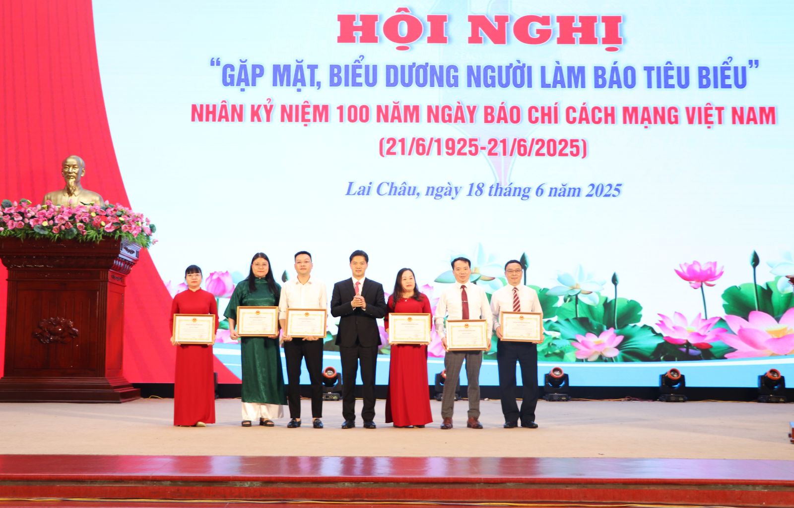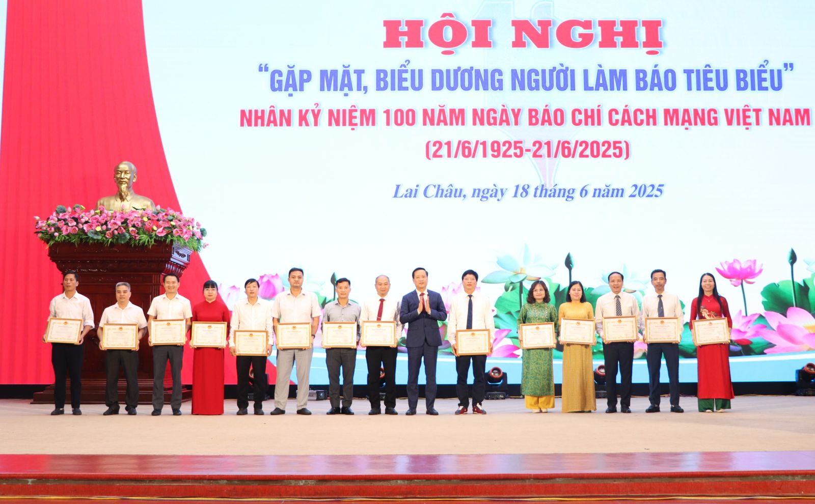 Để tri ân những người làm báo nhân Kỷ niệm 100 năm Ngày Báo chí Cách mạng Việt Nam (21/6/1925 - 21/6/2025), tại Hội nghị, Ban Tổ chức đã trao Bằng khen của Chủ tịch UBND tỉnh Lai Châu cho 6 tập thể, 15 cá nhân có thành tích xuất sắc trong Phong trào thi đua chào mừng Kỷ niệm 100 năm Ngày Báo chí cách mạng Việt Nam (21/6/1925 - 21/6/2025); trao Bằng khen của Chủ tịch UBND tỉnh Lai Châu cho 5 nhóm tác giả và tác giả có tác phẩm đoạt giải tại Giải thưởng sáng tác tác phẩm văn học, nghệ thuật, báo chí về chủ đề “Học tập và làm theo tư tưởng, đạo đức, phong cách Hồ Chí Minh” đợt II, giai đoạn 2021 - 2025.