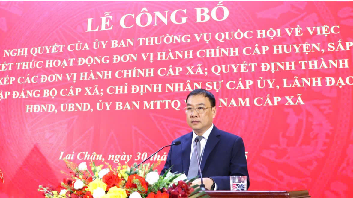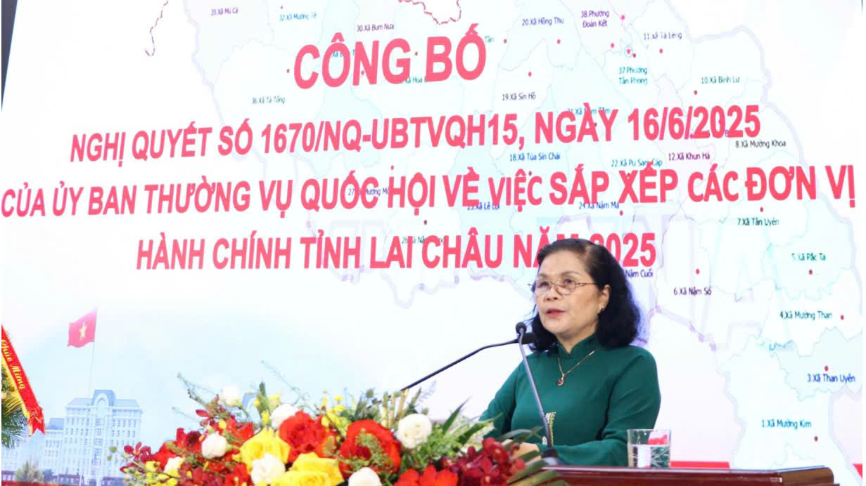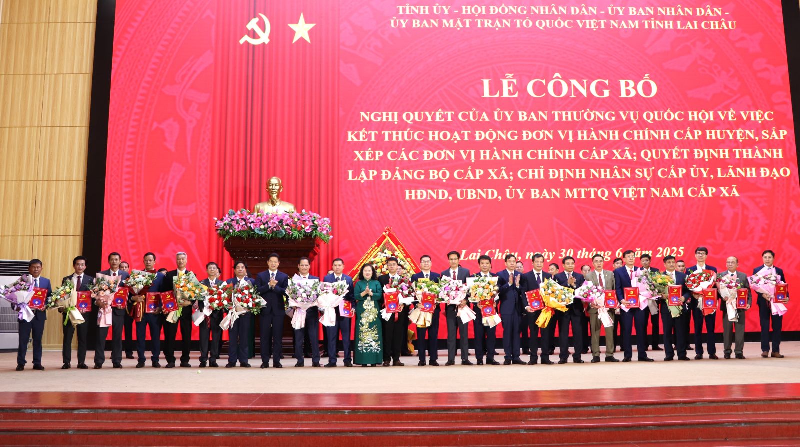 Tại buổi Lễ, đồng chí Giàng Páo Mỷ - Ủy viên Ban Chấp hành Trung ương Đảng, Bí thư Tỉnh ủy, Trưởng Đoàn Đại biểu Quốc hội tỉnh, Chủ tịch HĐND tỉnh đã công bố Nghị quyết số 1670/NQ-UBTVQH15 ngày 16/6/2025 của Ủy ban Thường vụ Quốc hội về sắp xếp các đơn vị hành chính cấp xã của tỉnh Lai Châu năm 2025. Theo đó, sắp xếp toàn bộ diện tích tự nhiên, quy mô dân số của 106 xã, phường, thị trấn trước đây thành 38 xã, phường mới.