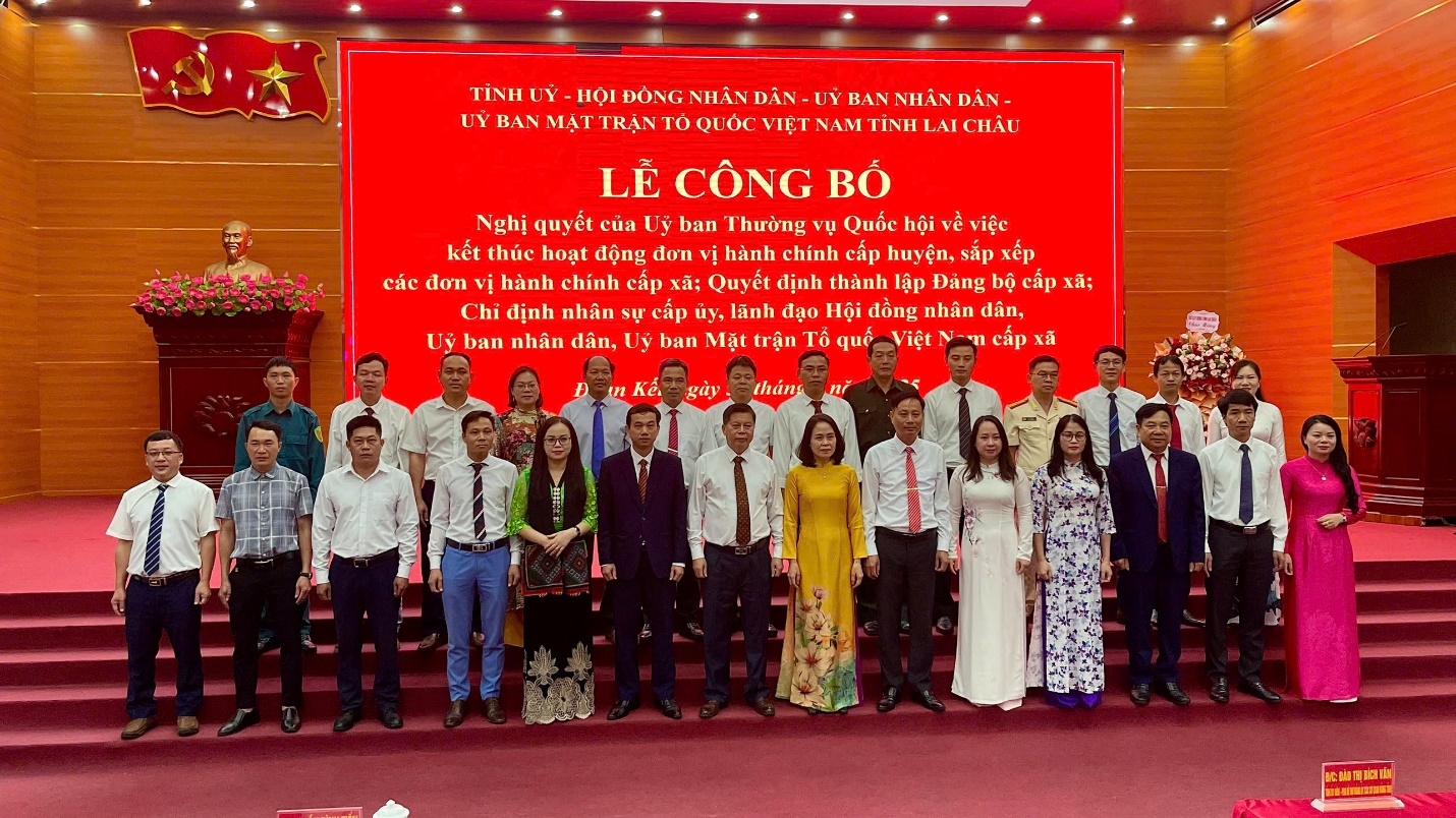 Sáng nay (30/6), Tỉnh ủy, HĐND, UBND, Ủy ban MTTQ Việt Nam tỉnh Lai Châu long trọng tổ chức Lễ công bố Nghị quyết của Ủy ban Thường vụ Quốc hội về việc kết thúc hoạt động đơn vị hành chính cấp huyện, sắp xếp các đơn vị hành chính cấp xã; Quyết định thành lập Đảng bộ cấp xã; chỉ định nhân sự cấp ủy, lãnh đạo HĐND, UBND, Ủy ban MTTQ Việt Nam cấp xã. Buổi Lễ được tổ chức trực tiếp tại điểm cầu tỉnh và truyền hình trực tiếp đến điểm cầu các xã mới sau sắp xếp, hợp nhất.