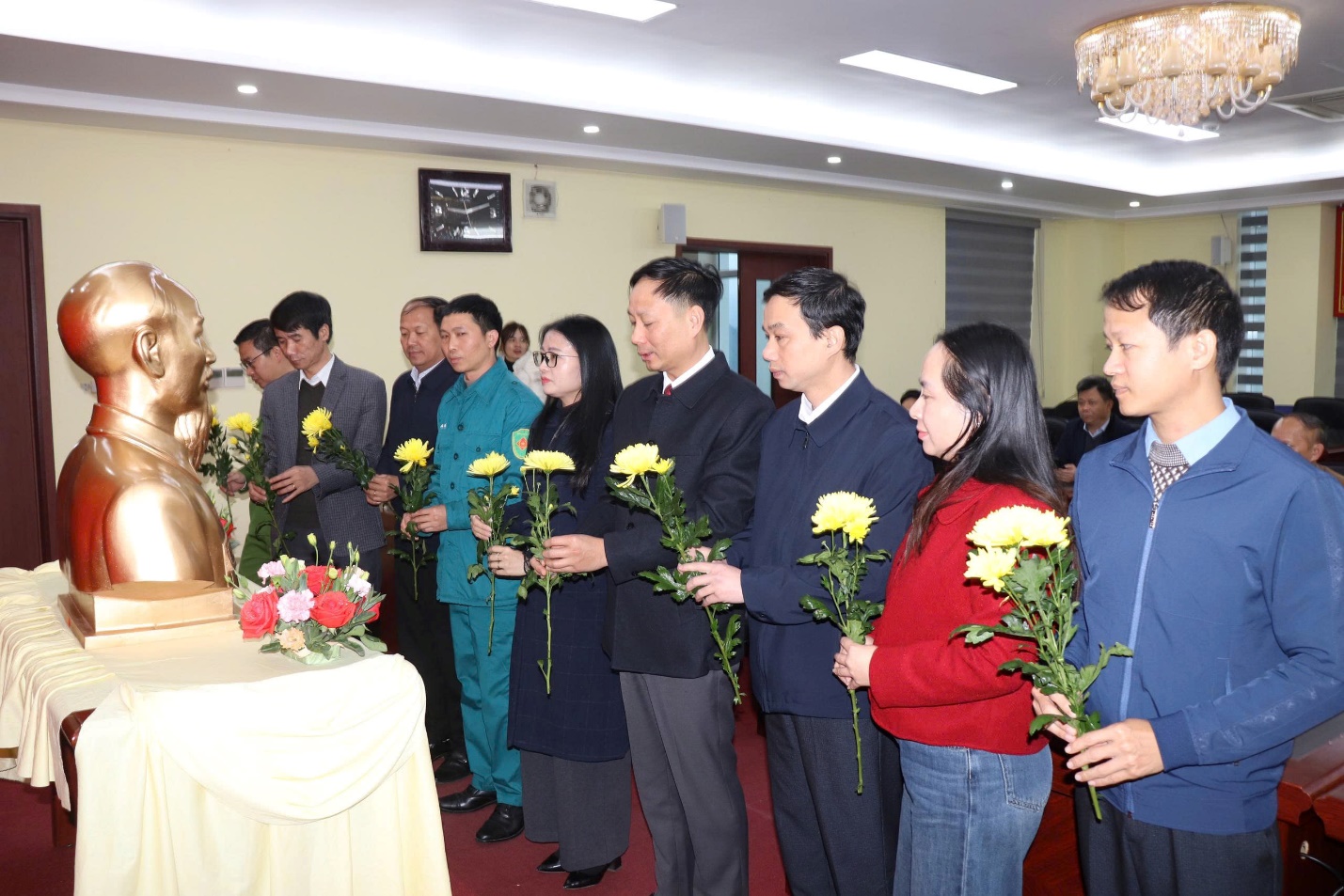 Lãnh đạo phường Đoàn Kết dâng hoa trước tượng Chủ tịch Hồ Chí Minh.