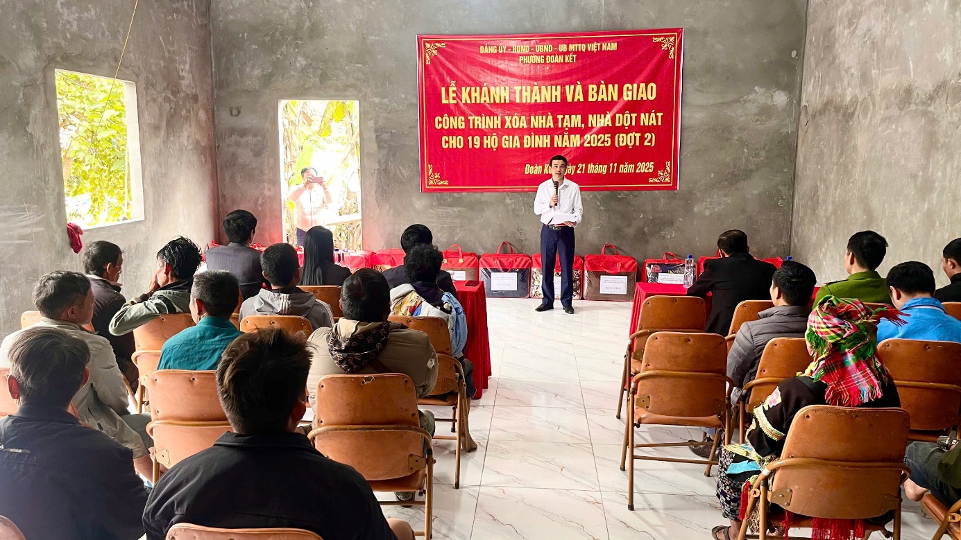 Chiều nay 21/11, tại Tổ dân phố Hồng Thu, phường Đoàn Kết tổ chức Lễ khánh thành và bàn giao công trình xoá nhà tạm, nhà dột nát trên địa bàn đợt 2, năm 2025. Dự lễ khánh thành có đồng chí Trần Đình Tiến – Phó Bí thư Thường trực Đảng uỷ phường; lãnh đạo HĐND, UBND, UBMTTQ, Ban xây dựng Đảng phường, lãnh đạo một số cơ quan, đơn vị, tổ chức chính trị xã hội phường cùng các gia đình thuộc diện xoá nhà tạm, nhà dột nát đợt 2 năm 2025.