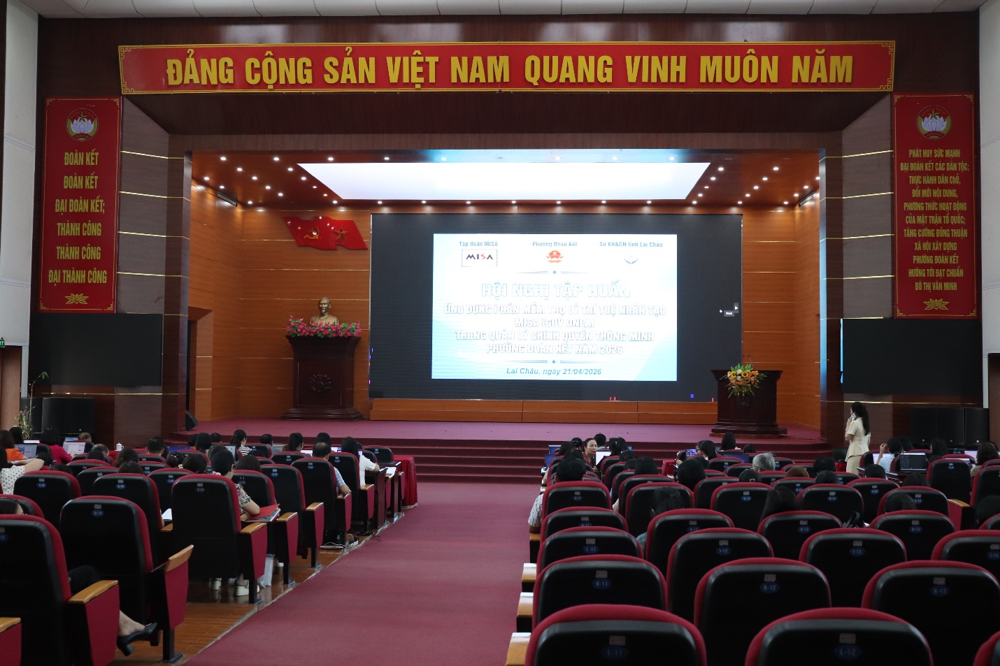 Chiều 21/4, Ủy ban nhân dân phường Đoàn Kết phối hợp với Sở Khoa học và Công nghệ và Công ty cổ phần MISA tổ chức lớp bồi dưỡng, tập huấn về ứng dụng trí tuệ nhân tạo (AI) năm 2026 cho trên 100 học viên là cán bộ, công chức, viên chức thuộc các cơ quan tham mưu giúp việc Đảng ủy, UBND, UBMTTQ, Trung tâm Chính trị, Trung tâm dịch vụ tổng hợp, Trạm y tế, Ban giám hiệu các trường học trên địa bàn.
