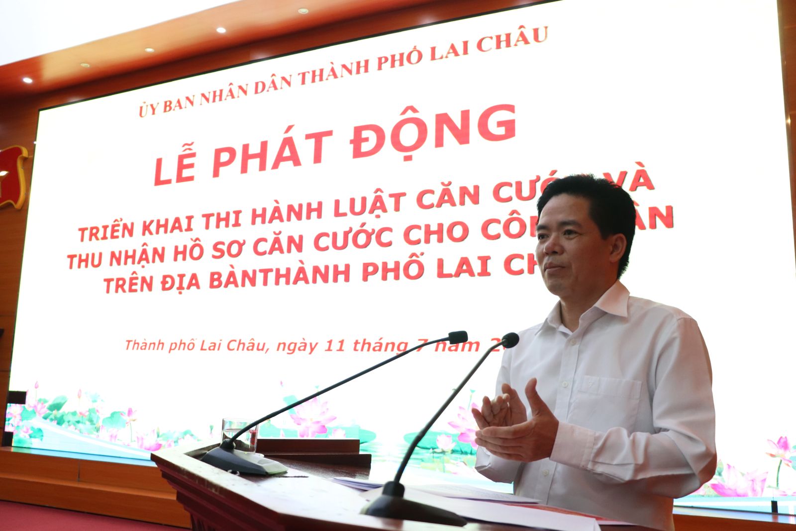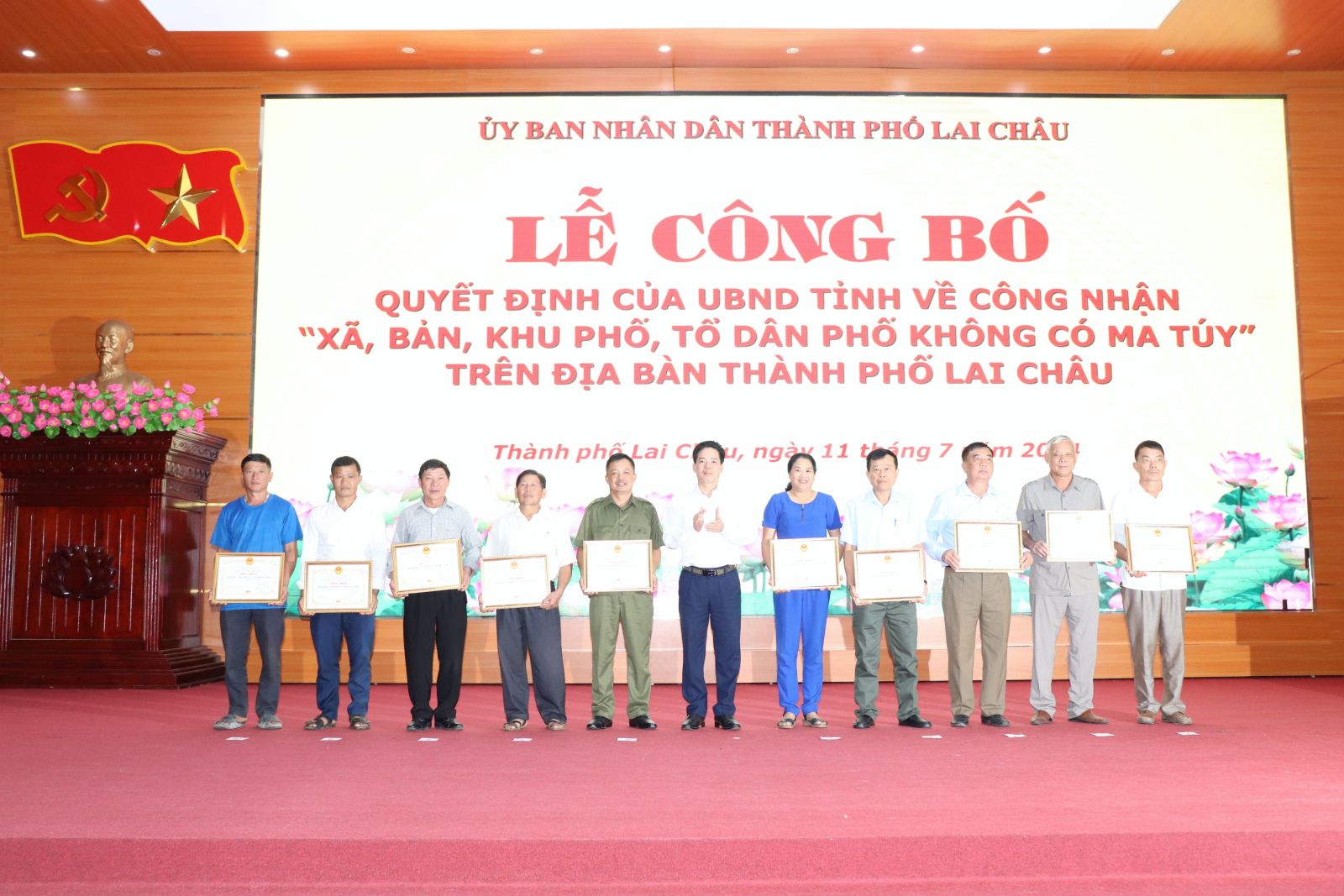 Chiều ngày 11/7, UBND thành phố Lai Châu tổ chức Lễ Công bố Quyết định của UBND tỉnh về công nhận “xã, bản, khu phố, tổ dân phố không có ma túy”; phát động triển khai thi hành Luật Căn cước và thu nhận hồ sơ căn cước cho công dân trên địa bàn thành phố Lai Châu. Dự buổi lễ có các đồng chí: Tống Thanh Bình – UVBTV Tỉnh ủy, Bí thư Thành ủy; Nguyễn Văn Nghiệp - Phó Bí thư Thành ủy, Chủ tịch UBND thành phố; Thường trực Thành ủy, HĐND, UBND, UBMTTQ thành phố; thành viên Ban Chỉ đạo Phòng chống tội phạm thành phố, các xã, phường; lãnh đạo Công an thành phố; đại diện Ban Giám hiệu các trường học trên địa bàn thành phố.