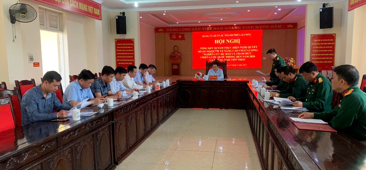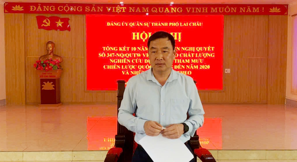 Chiều ngày 10/4, Đảng ủy Quân sự thành phố Lai Châu tổ chức hội nghị tổng kết 10 năm thực hiện nghị quyết số 347-NQ/QUTW ngày 23/5/2015 về nâng cao chất lượng nghiên cứu, dự báo và tham mưu chiến lược quốc phòng đến năm 2020 và những năm tiếp theo. Đồng chí Tống Thanh Bình – UVBTV Tỉnh ủy, Bí thư Thành ủy, Bí thư Đảng ủy Quân sự thành phố chủ trì hội nghị.
