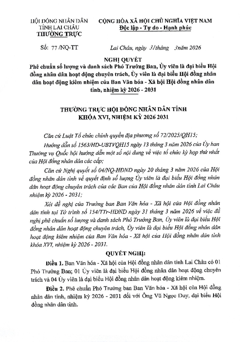 | Tiêu đề văn bản | Nghị quyết phê chuẩn số lượng và danh sách Phó Trưởng Ban, Ủy viên là đại biểu HĐND hoạt động chuyên trách, Ủy viên là Đại biểu HĐND hoạt động kiêm nhiệm của Ban VHXH HĐND tỉnh, nhiệm kỳ 2026-2031 | ||