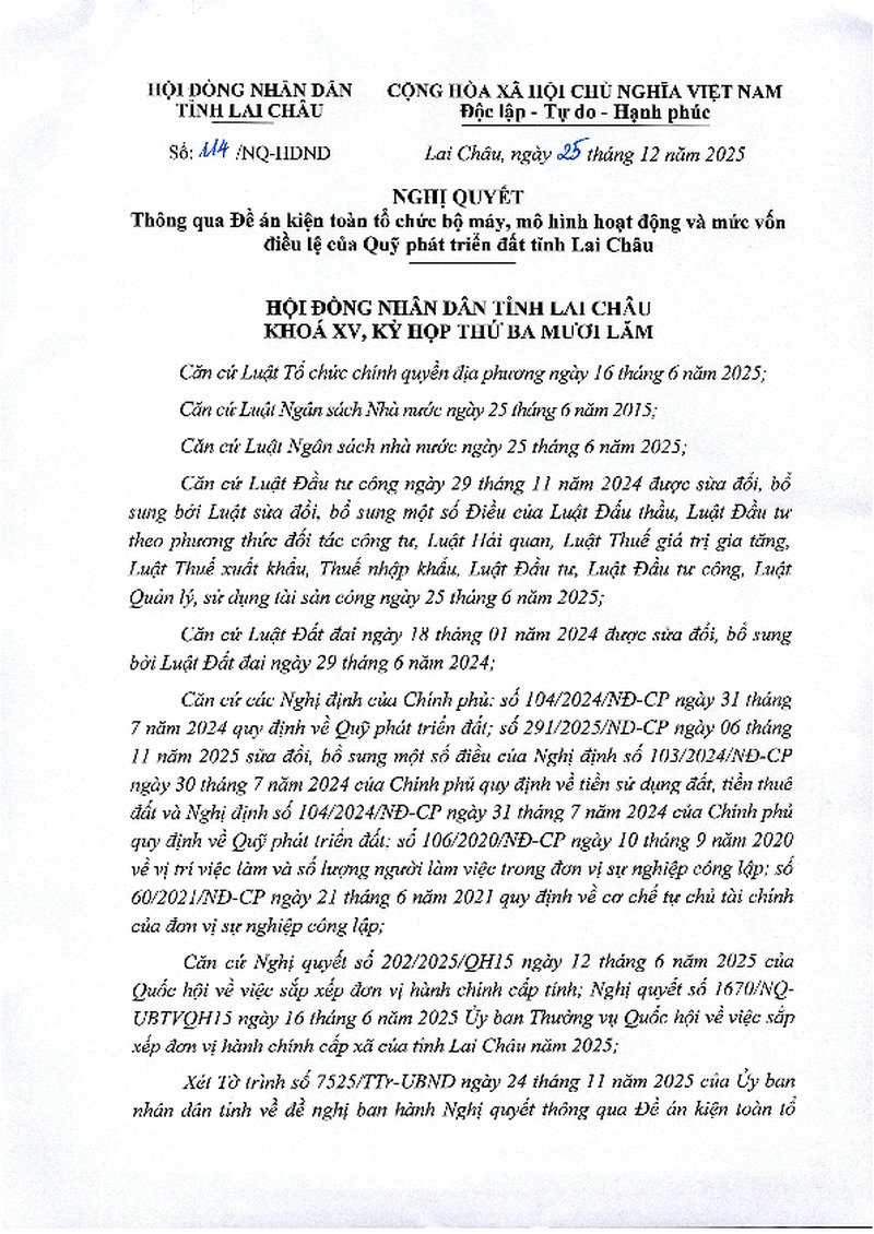 | Tiêu đề văn bản | Nghị quyết thông qua Đề án kiện toàn tổ chức bộ máy, mô hình hoạt động và mức vốn điều lệ của Quỹ phát triển đất tỉnh Lai Châu. | ||