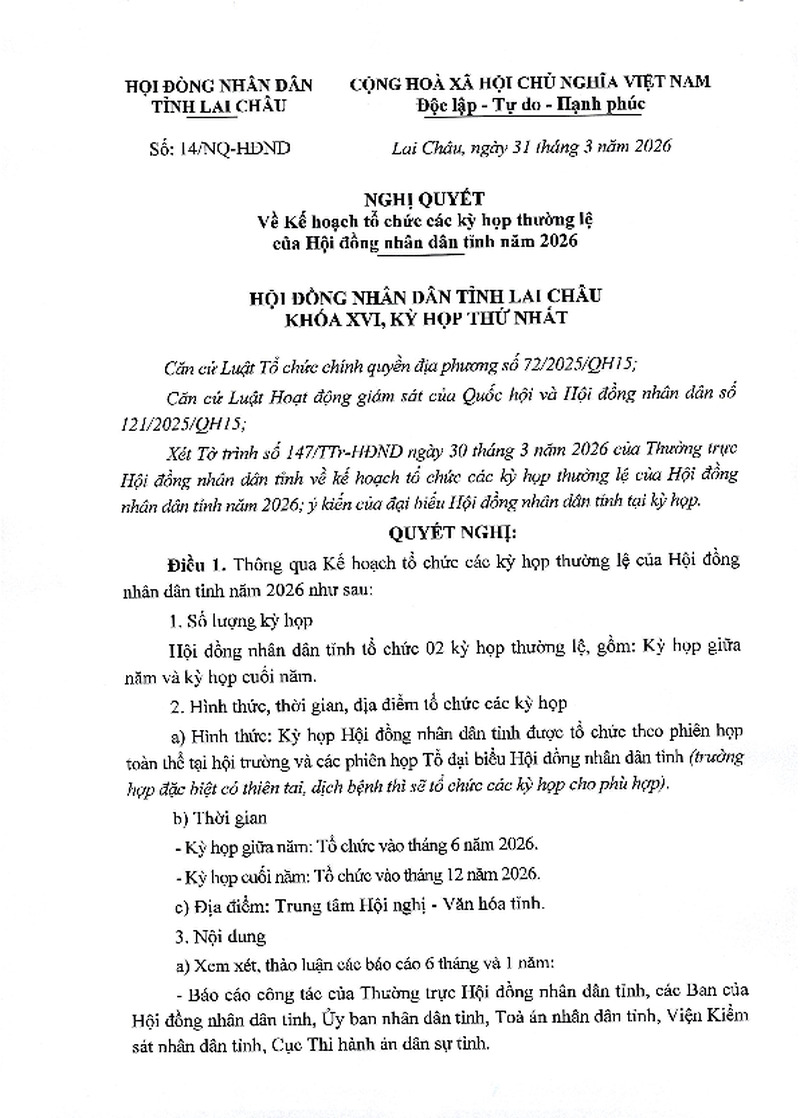 Nghị quyết về kế hoạch tổ chức các ký họp thường lệ của HĐND tỉnh năm 2026