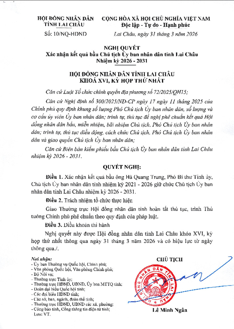 Nghị quyết xác nhận kết quả bầu Chủ tịch UBND tỉnh Lai Châu nhiệm kỳ 2026-2031