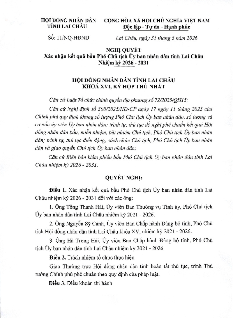 | Tiêu đề văn bản | Nghị quyết xác nhận kết quả bầu Phó Chủ tịch Ủy ban nhân dân tỉnh Lai Châu khóa XVI, nhiệm kỳ 2026-2031 | ||