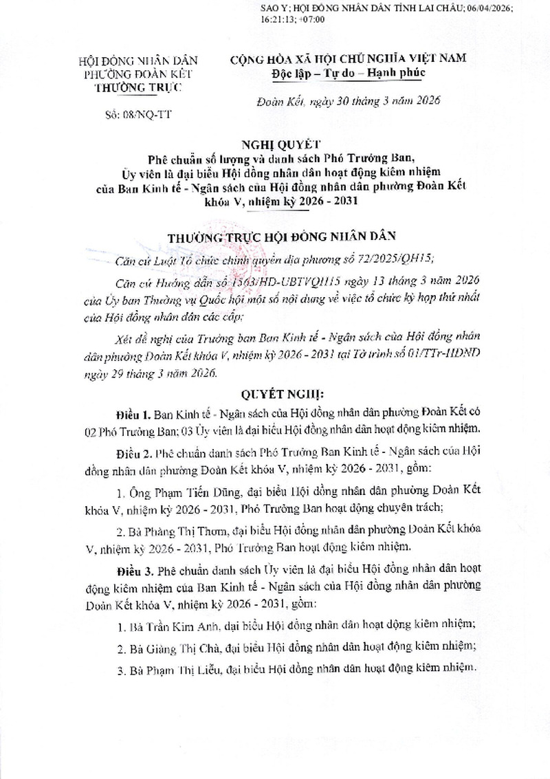 | Tiêu đề văn bản | Nghị quyết: Phê chuẩn số lượng và danh sách Phó Trưởng Ban, Ủy viên là đại biểu Hội đồng nhân dân hoạt động kiêm nhiệm của Ban Kinh tế - Ngân sách của Hội đồng nhân dân phường Đoàn Kết, khóa V, nhiệm kỳ 2026-2031 | ||