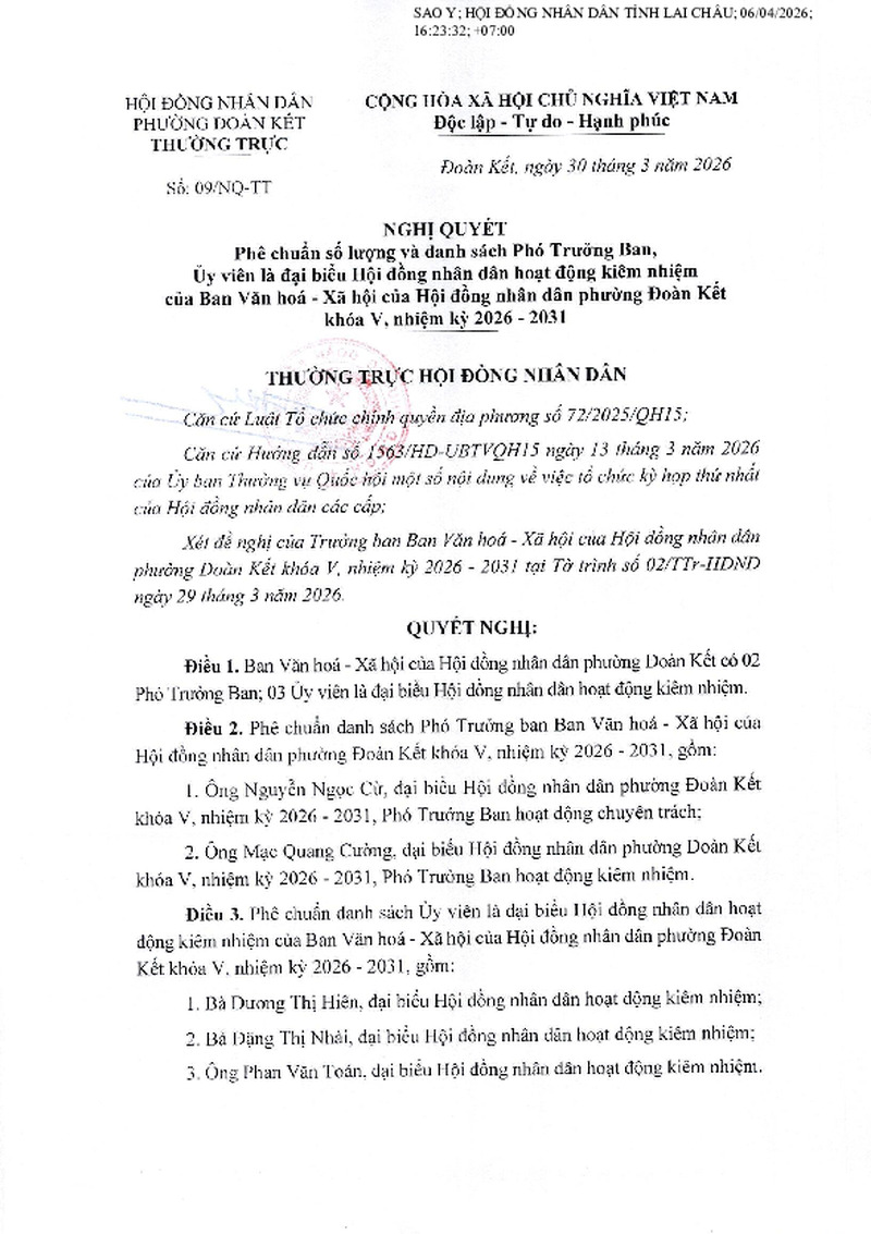 | Tiêu đề văn bản | Nghị quyết: Phê chuẩn số lượng và danh sách Phó Trưởng Ban, Ủy viên là đại biểu Hội đồng nhân dân hoạt động kiêm nhiệm của Ban Văn hóa - Xã hội của Hội đồng nhân dân phường Đoàn Kết, khóa V, nhiệm kỳ 2026-2031 | ||