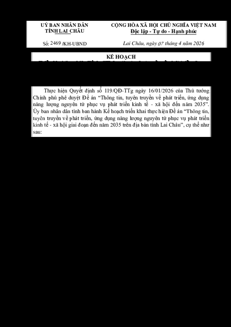 | Tiêu đề văn bản | Triển khai thực hiện Đề án "Thông tin, tuyên truyền về phát triển, ứng dụng năng lượng nguyên tử phục vụ phát triển kinh tế - xã hội giai đoạn đến năm 2035 trên địa bàn tỉnh Lai Châu" | ||