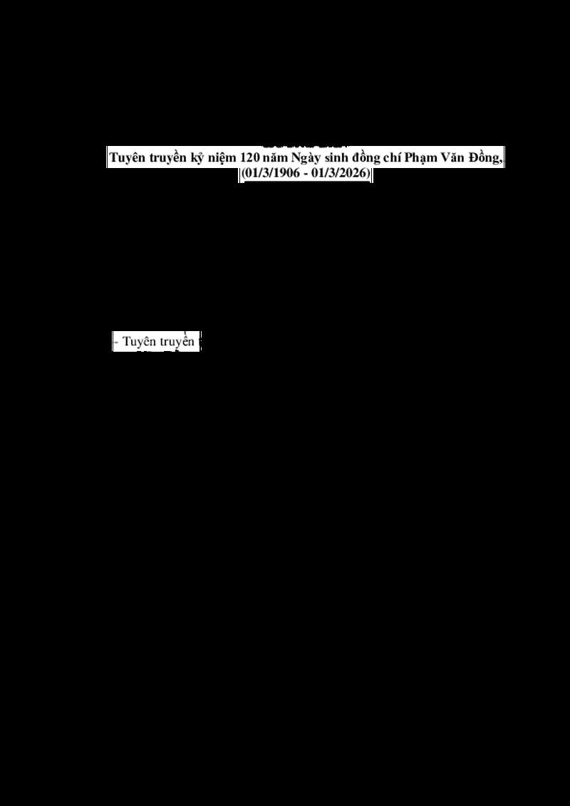 | Tiêu đề văn bản | Tuyên truyền kỷ niệm 120 năm Ngày sinh đồng chí Phạm Văn Đồng, (01/3/1906 - 01/3/2026). | ||