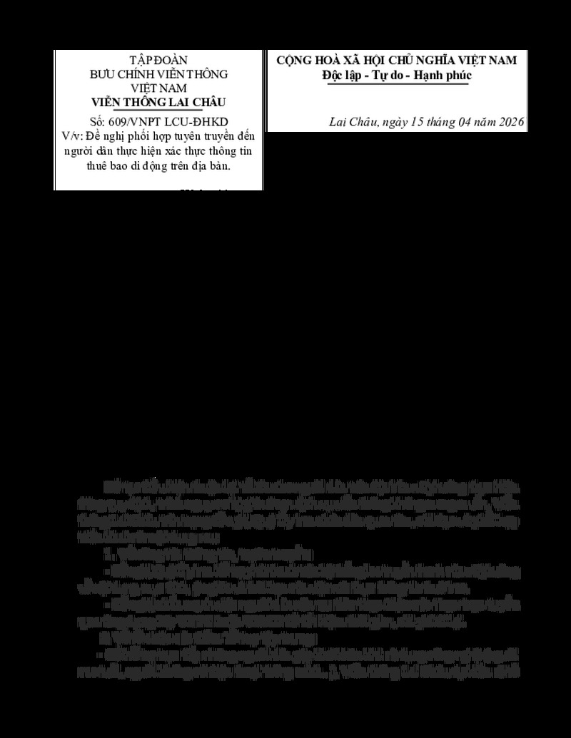 | Tiêu đề văn bản | V/v: Đề nghị phối hợp tuyên truyền đến người dân thực hiện xác thực thông tin thuê bao di động trên địa bàn | ||