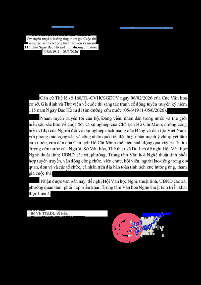 | Tiêu đề văn bản | V/v tuyên truyền hưởng ứng tham gia Cuộc thi sáng tác tranh cổ động tuyên truyền kỷ niệm 115 năm Ngày Bác Hồ ra đi tìm đường cứu nước (05/6/1911 - 05/6/2026) | ||