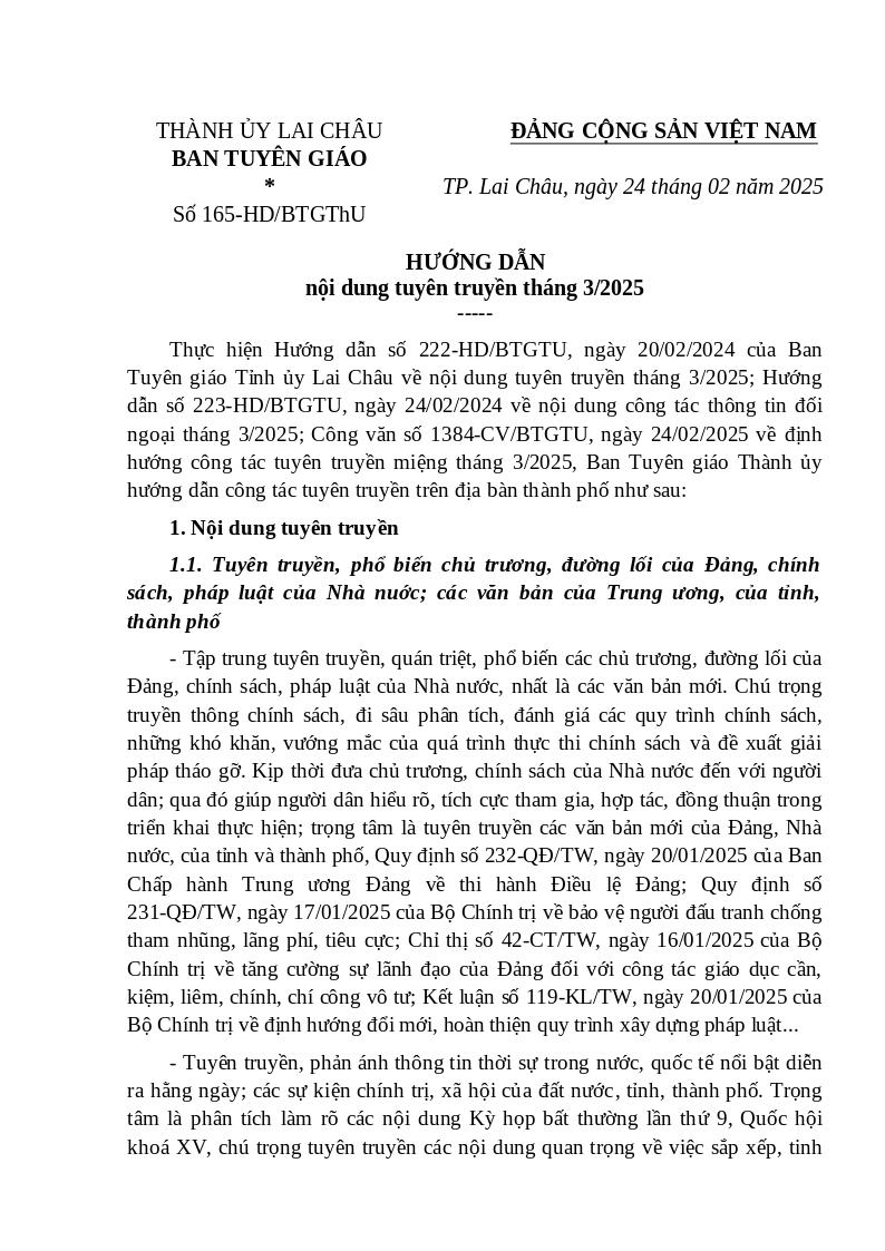 | Tiêu đề văn bản | Hướng dẫn nội dung tuyên truyền tháng 3 năm 2025 | ||